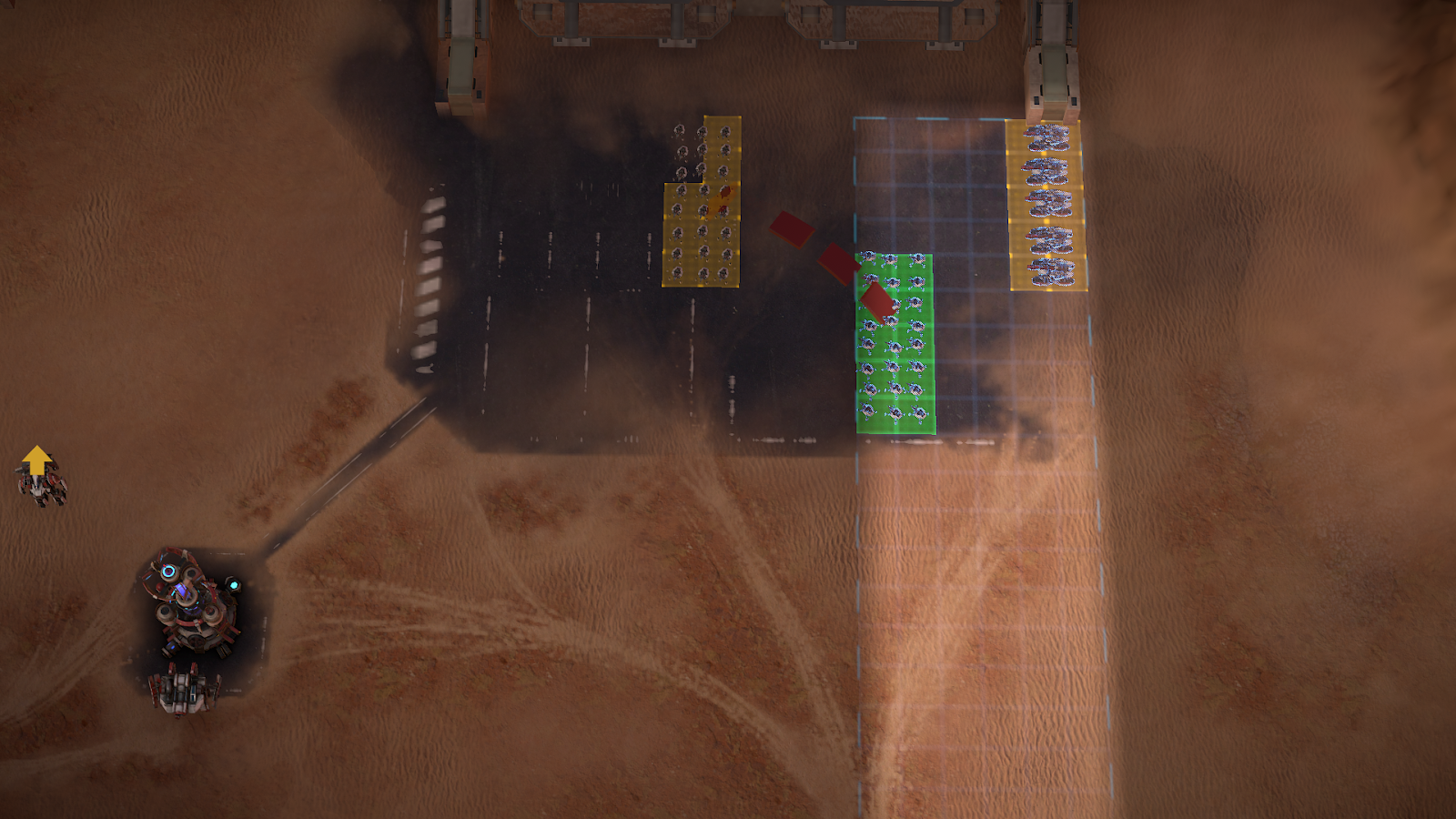A good way to position the units on the flank. The 4 squares gap from the top wall is the biggest you can have, while keeping the Sledgehammers safe from Missile Devices.